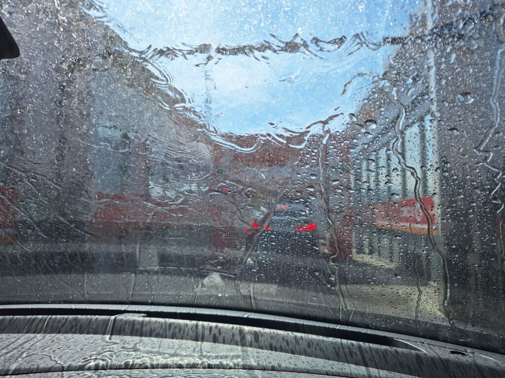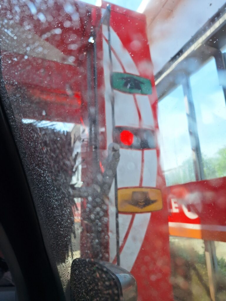 然後就往前開,慢慢開,開到洗車機的燈號變成紅燈以後,就可以熄火,拉上手煞車,好好享受一下。