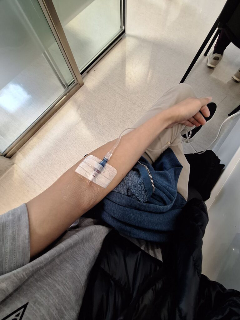 這次只等了10分鐘吧,護士幫我量了體溫,退燒的paracetamol也不用口服了,直接從剛剛埋好的針頭注射。也開始注射抗生素,護士說大概再一小時就可以打完。注射的期間,護士也有問要不要來個三明治,但說真的我也沒什麼胃口就作罷。