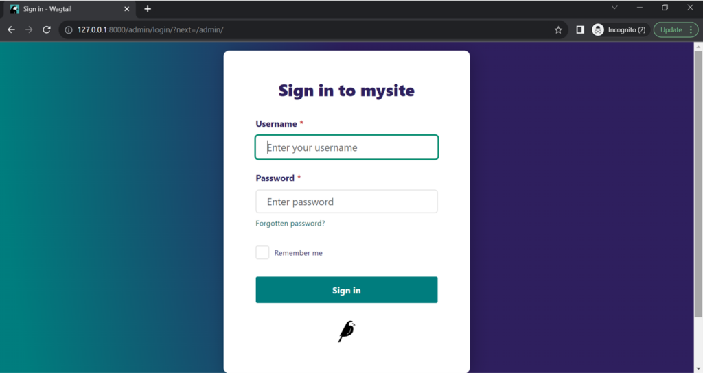 (venv) PS C:\wagtail\mysite>Code language:PowerShell(powershell)